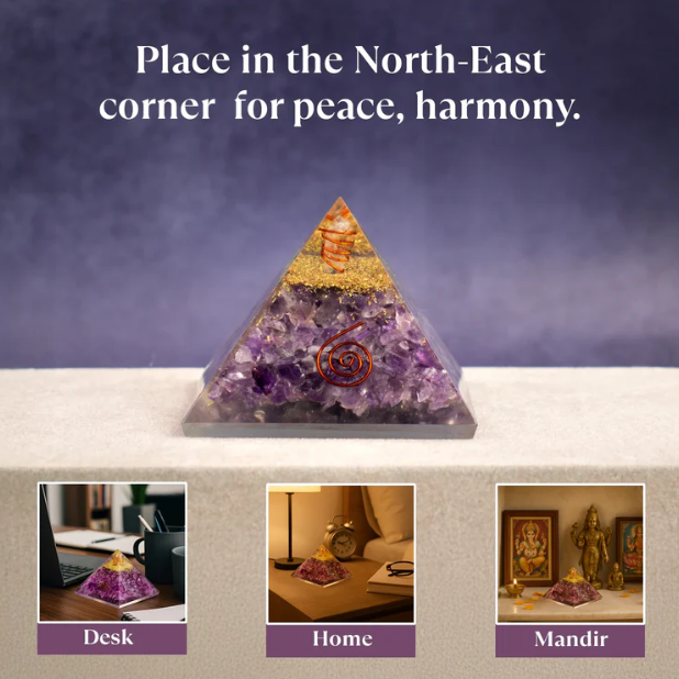 The Orgonite Amethyst Pyramid blends amethyst, copper, resin, and sacred geometry to create a  crystal tool with powerful  transformation. It helps calms an overactive mind, reduces stress, and restores emotional balance. Known to activate the Third Eye and Crown Chakras,