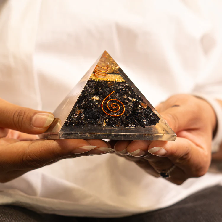 Black Obsidian, revered in Vedic practices, is a fierce protector against negativity and psychic disturbances, especially under Saturn (Shani) or Rahu’s influence. When embedded in an Orgonite Pyramid—a structure made of resin, copper metals, and crystals— strengthens the crystal’s natural shield, offering powerful grounding during inner transformation