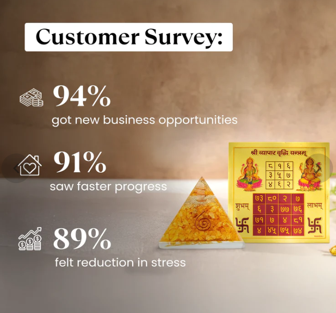 The Citrine Pyramid, also called theΒ Merchant’s Stone, is believed to attract wealth, confidence, and good fortune. Paired with the sacred Vyappar Vriddhi Yantra (6Γ—6 inch), it is said to remove obstacles and support business growth. Together, they create a harmonious that makes this festive season brighter, bringing prosperity and new opportunities to your workplace.